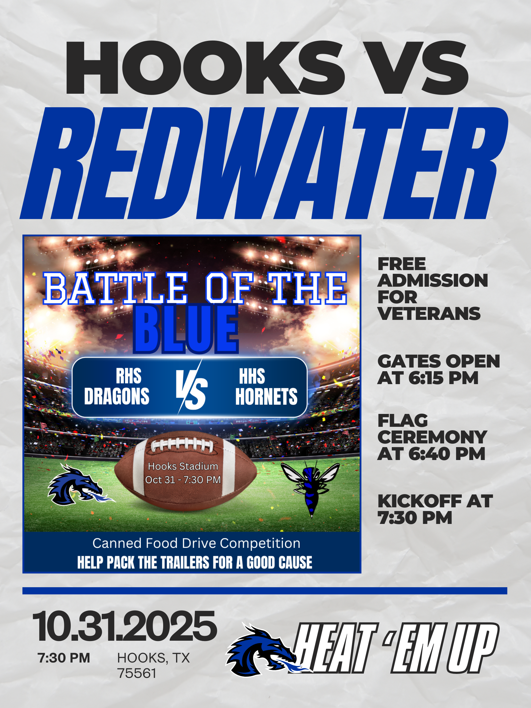 BATTLE OF THE BLUE between Redwater ISD and Hooks ISD has started! Make plans to attend the Battle of the Blue football game on Friday, October 31! Hooks ISD will also have a flag ceremony during the National Anthem in honor of Veterans Day on November 11.