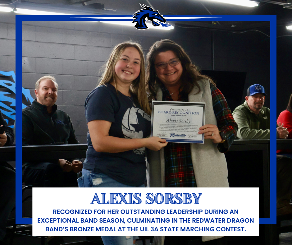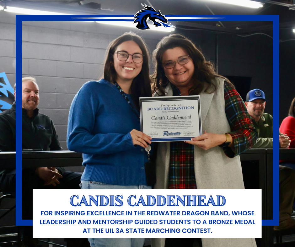 The Redwater ISD Board of Trustees proudly recognized our band directors and drum major following an exceptional season and a Bronze Medal finish at the UIL 3A State Marching Contest in San Antonio.